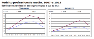 Molto semplicemente guardiamo questi grafici e mettiamo a confronto ingegneri e architetti a cavallo della crisi… una catastrofe!