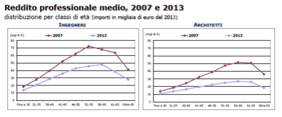 La combinazione di crisi economica e inversione del ciclo edilizio ha comportato in sei anni (dal 2006 al 2012) la perdita di quasi un terzo del reddito professionale annuo; nel 2012 il reddito medio è sceso a poco più di 20 mila euro. Contemporaneamente, la quota degli investimenti in costruzioni riferibili ai soli servizi di progettazione è scesa del -36% (2012 -2006) che ha comportato un calo di oltre il -45% del mercato disponibile per il singolo professionista. La percentuale degli architetti che ha dichiarato di aver subito in un anno, una forte decrescita del proprio fatturato è aumentata, dal 17,6% del 2011 al 37% nelle attese del 2013. Crolla la domanda da parte di imprese di costruzioni e enti pubblici ed è negativo anche il mercato legato alla clientela privata non residenziale.