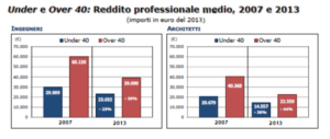 A dieci anni dal conseguimento della laurea, il reddito mensile medio netto di un giovane architetto è di circa 1.300 euro, contro una media complessiva di 1.600 euro; il divario è maggiore se confrontato con il reddito medio dei laureati in ingegneria (2.000 euro) e inferiore anche alle medie di geologi, biologi e psicologi. Oltre il 40% degli architetti che nel 2012, in qualità di collaboratori o dipendenti degli studi di architettura hanno indicato un impegno lavorativo regolare, guadagna meno di mille euro al mese, il 30% tra 1.000 e 1.500, il 15% meno di 500 e il 12% tra 1.500 e 2.000 euro.